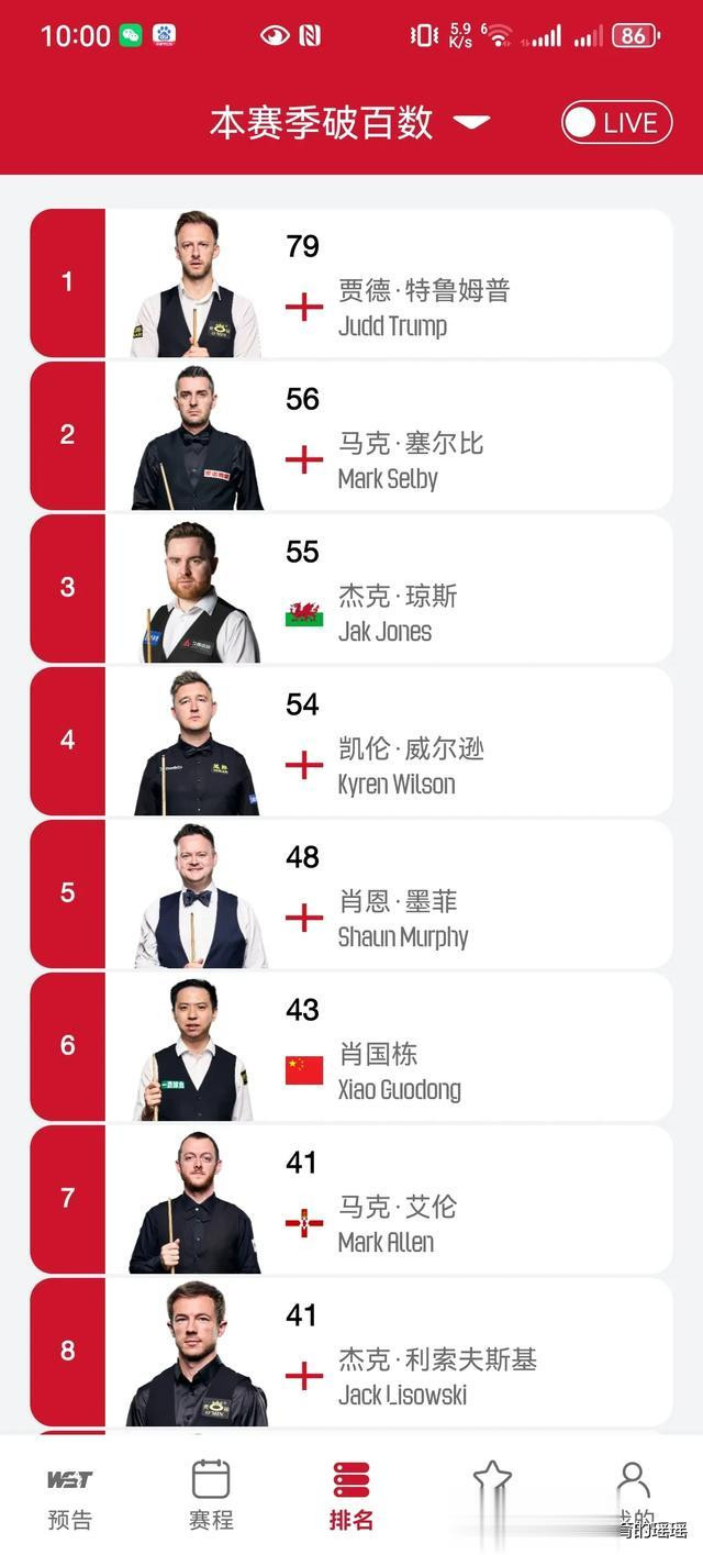此外在历史的单杆破百党单当中。马克艾伦的数据已经是跃升到了历史的第九成功追平了前方的马克威廉姆斯。接下来他的目标就是去追击肖恩墨菲和丁俊晖两位球员。马克艾伦成名已久然而在自己职业生涯吃出并没有表现出太多的成绩然而是在最近几个赛季也是单干破百的效率很高而且进攻的状态也是很好。马克艾伦也是有望继续乘胜追击向丁俊晖的记录发起挑战。在历史的单杆破百榜单当中,肖恩墨菲继续甩开了和丁俊晖之间的差距,肖恩墨菲的数据来到了704次,而丁俊晖的数据依旧是停留在690次。