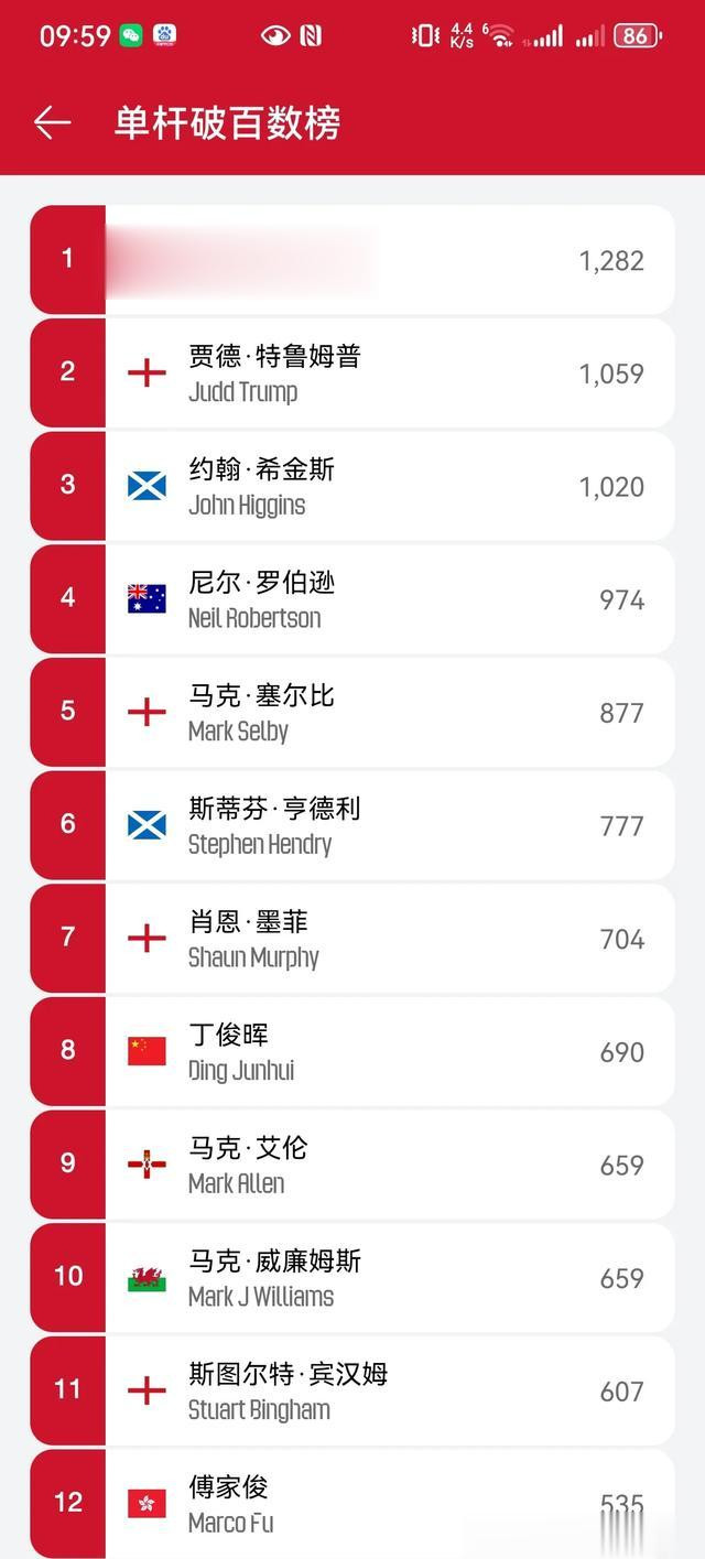 另外拿到世界公开赛冠军的约翰希金斯历史的单杆破百榜单来到了1020次,也是继续刷新的,自己的生涯新纪录。不过距离前方的特鲁姆普也是差距越来越大。而且想要守住第三的位置,也并不好靠后方的尼尔罗逊和马克塞尔比也是不断接近约翰,希金斯。